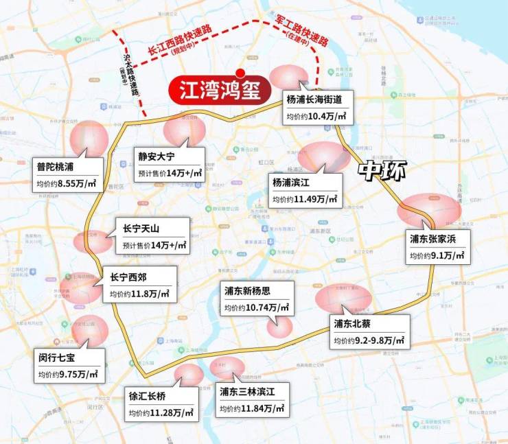 再来看中环沿线新房价格当时的格式。规划强势的如徐汇长桥,三林滨江,静安大宁,杨浦滨江等,价格全面打破11万+/㎡。